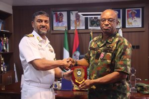 Earlier in the day, Rear Admiral Oamen received Captain Varghese, Colonel Singh, and other senior officers of the INS Tushil for a courtesy call at the headquarters of the Western Naval Command in Apapa, Lagos.