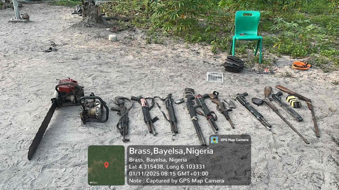 In a bold operation aimed at ensuring maritime security, the Nigerian Navy (NN), under Operation DELTA SANITY II, has dismantled a pirates’ and kidnappers’ camp in Fununu community, Brass Local Government Area, Bayelsa State. The raid, conducted on Saturday, January 11, 2025, resulted in the arrest of two suspects and the recovery of a significant cache of weapons and equipment.