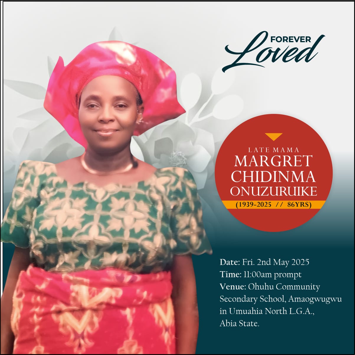 The Onuzuruike family of Amaogwugwu Umuhu, Umuahia North Local Government Area, Abia State, has announced the passing of their beloved mother, grandmother, and great-grandmother, Late Mama Margret Chidinma Onuzuruike, who departed this life at the age of 86.