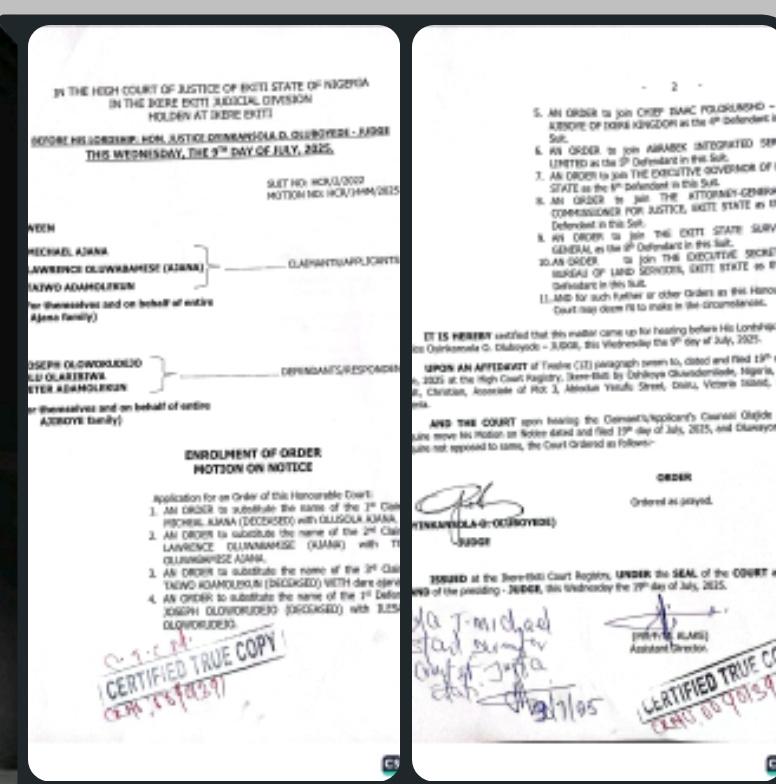 In his earlier defence, Oba Adu-Alagbado said the initiative was in the town’s interest and that multiple families had been asked to contribute land for the development. He denied personal interest in the project and described the family’s accusations as defamatory.