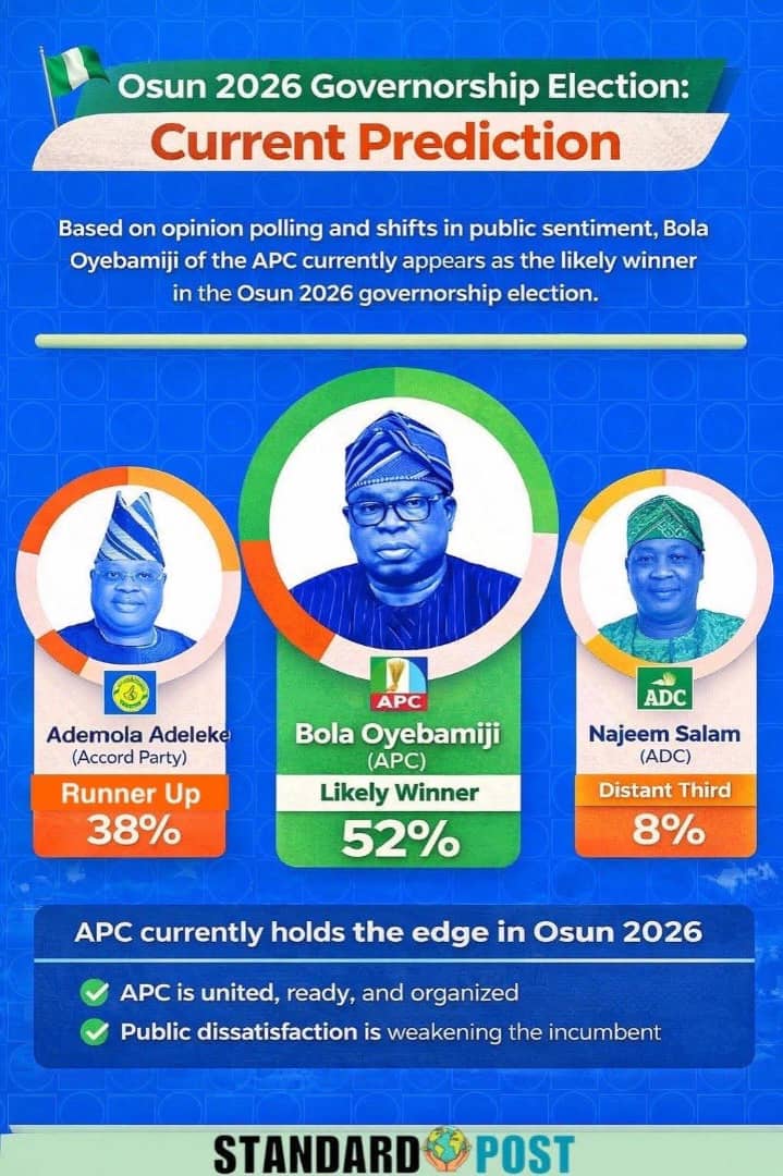 A recently concluded opinion poll conducted by a reputable media organisation, Standard Post, has projected victory for the All Progressives Congress (APC) governorship candidate, Asiwaju Munirudeen Bola Oyebamiji (AMBO), in the August 8, 2026 election.