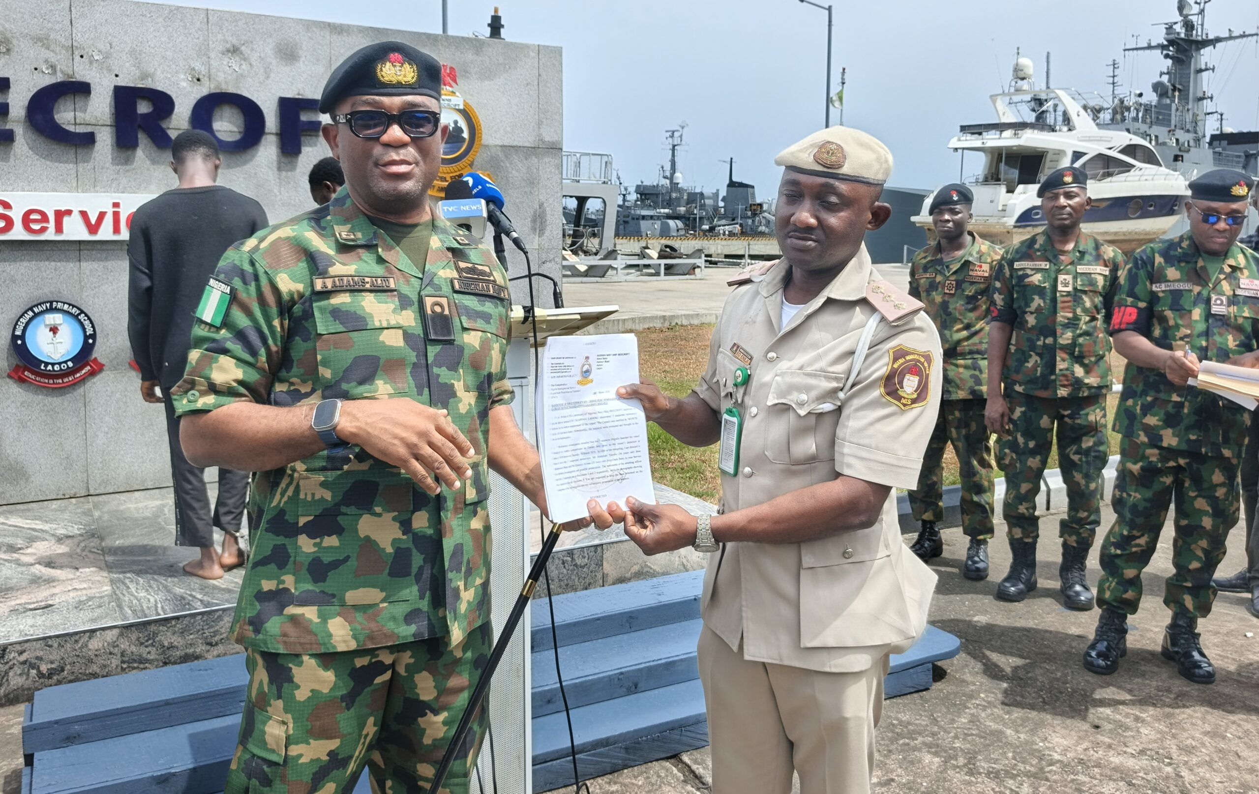 The handover took place on Tuesday, March 24, 2026, at the naval base in Lagos, where the Commander of NNS BEECROFT, Commodore Aiwuyor Augustine Adams-Aliu, formally transferred custody of the suspects to immigration authorities.